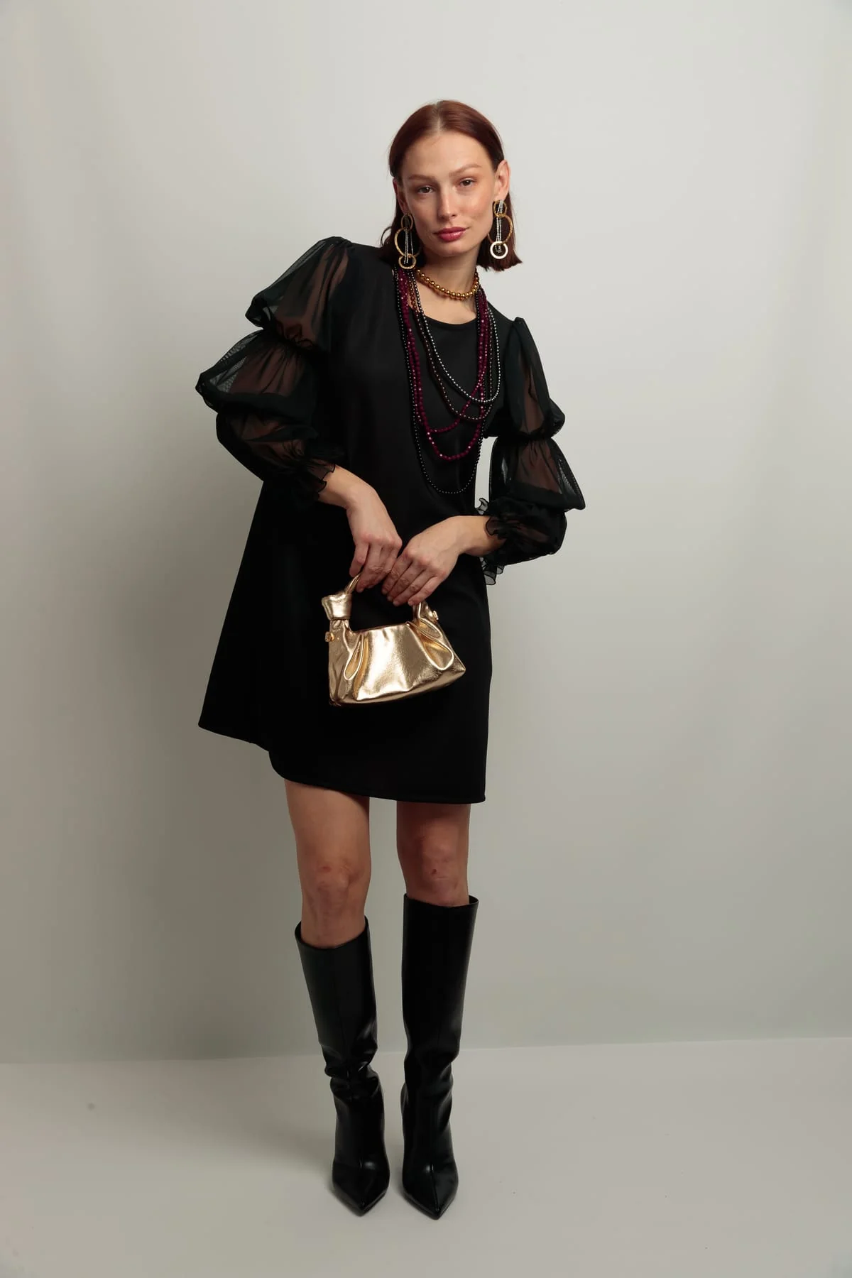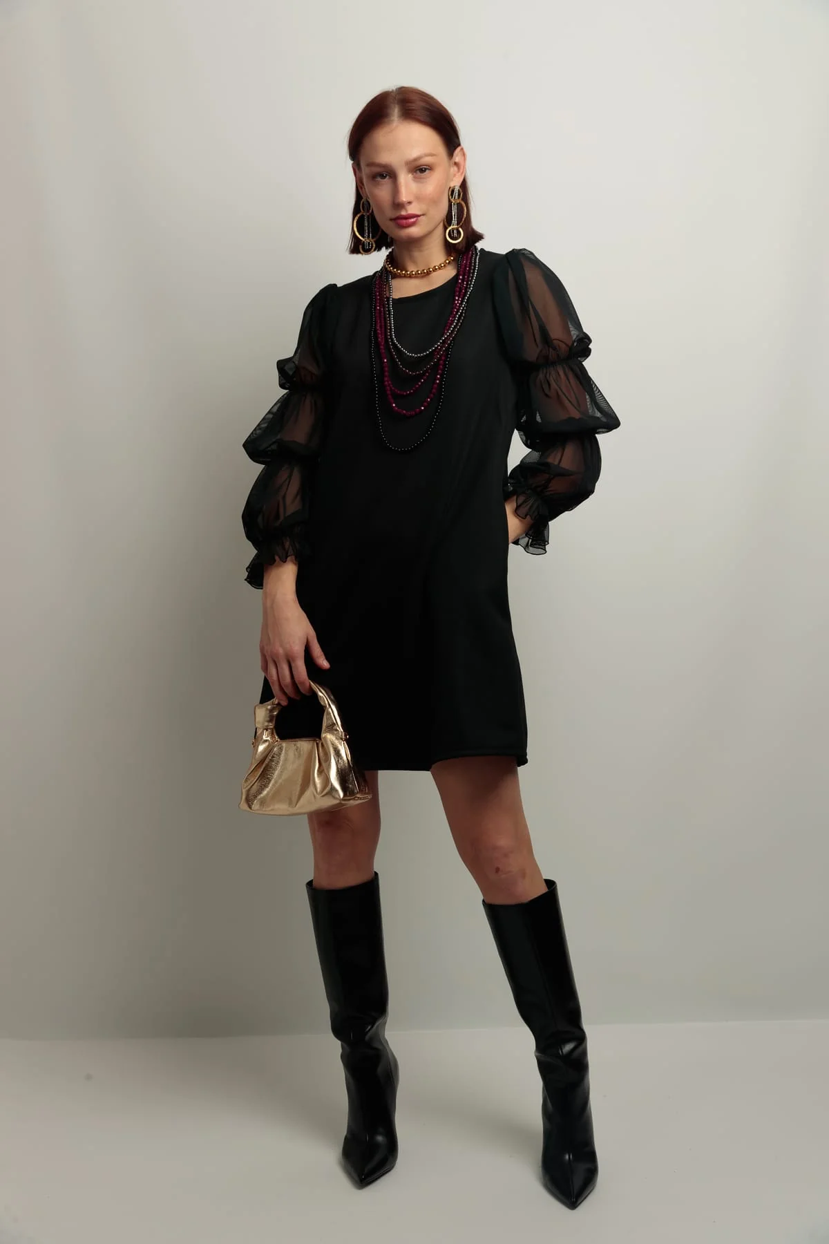 Vestido corto, en color negro, con cuello redondo, corte evase y con bolsillos . Mangas abullonadas en tejido de tul elástico.
