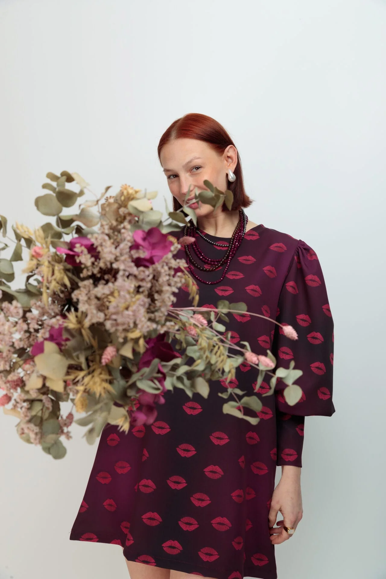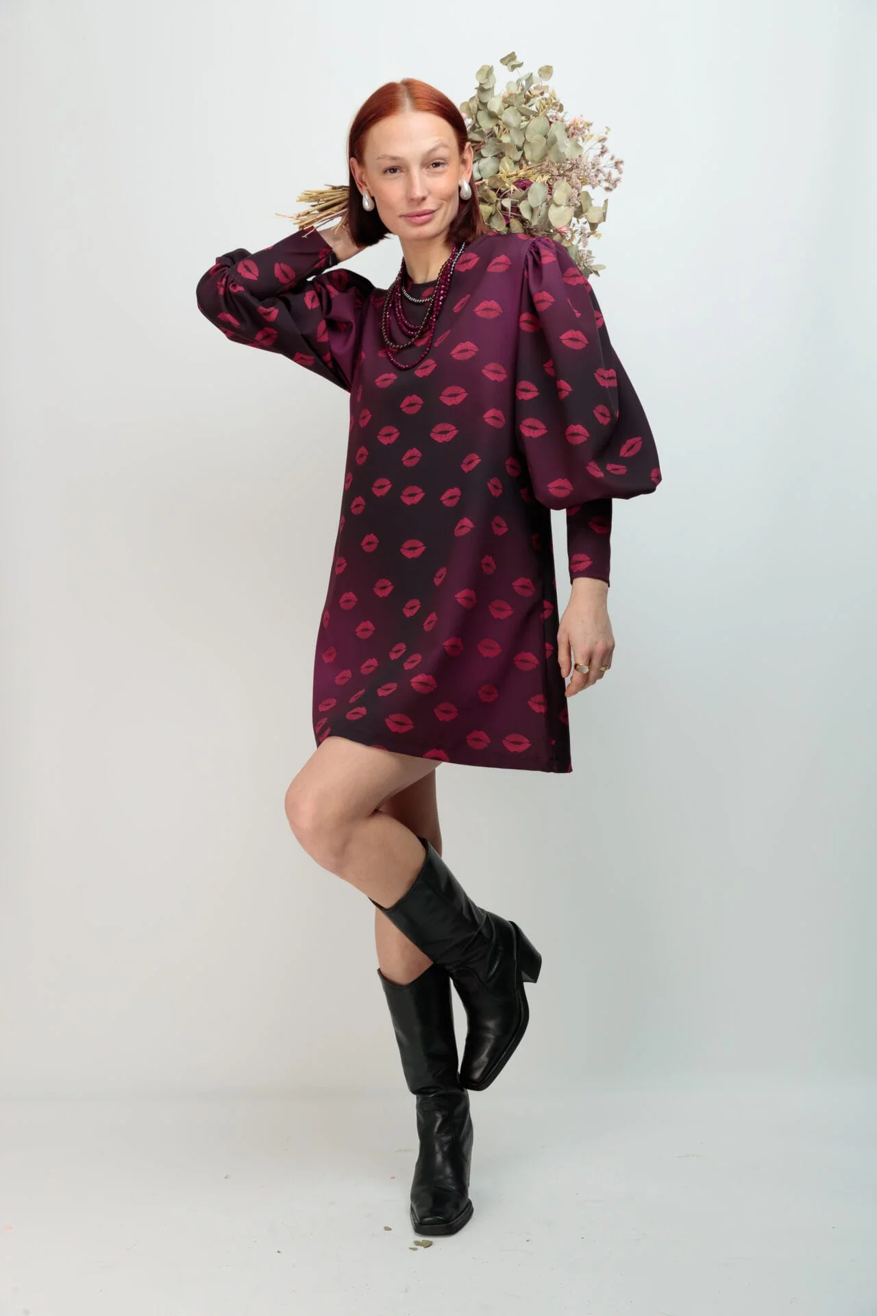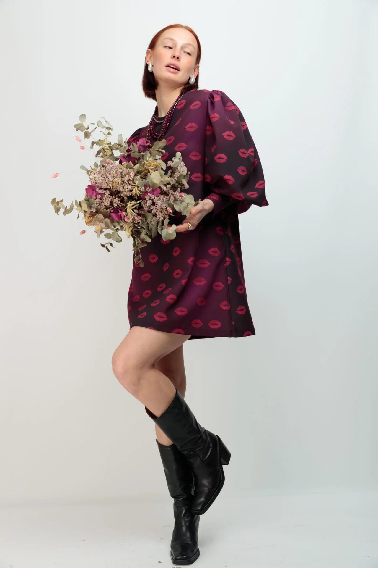 Vestido corto estampado, con cuello redondo, corte evasé y con bolsillos. Detalle de manga muy abullonada con puño ajustado con cierre de cremallera en el puño.