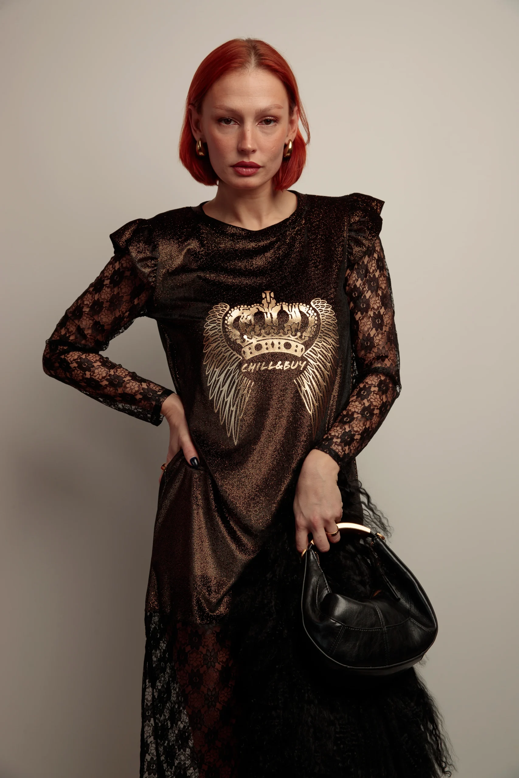 Un diseño que combina lujo, fuerza y feminidad. Este vestido destaca por su cuerpo de terciopelo negro con destellos dorados, que aporta un efecto luminoso y sofisticado, y por su falda y mangas de encaje negro, que añaden transparencia, textura y un toque de seducción.