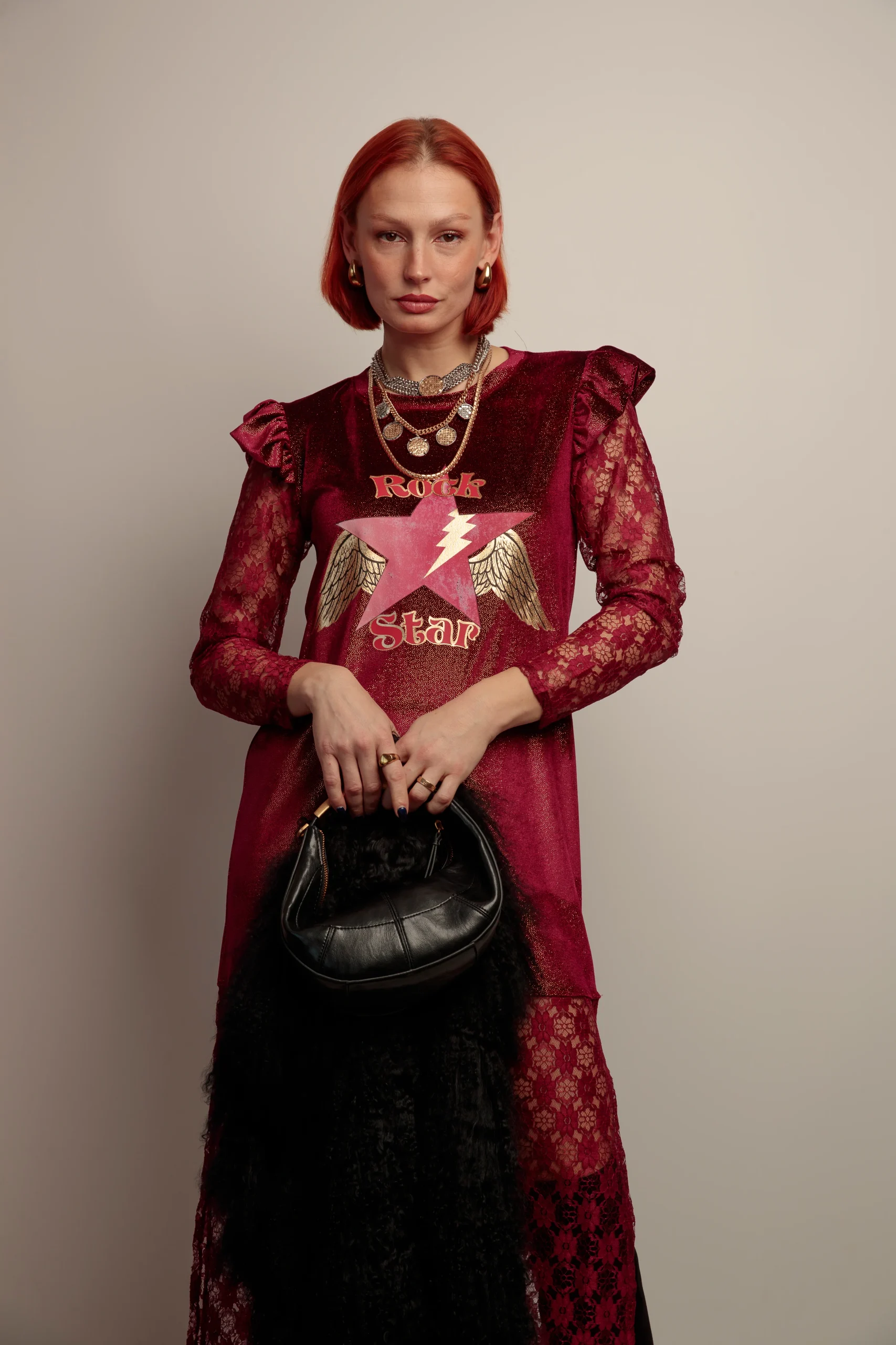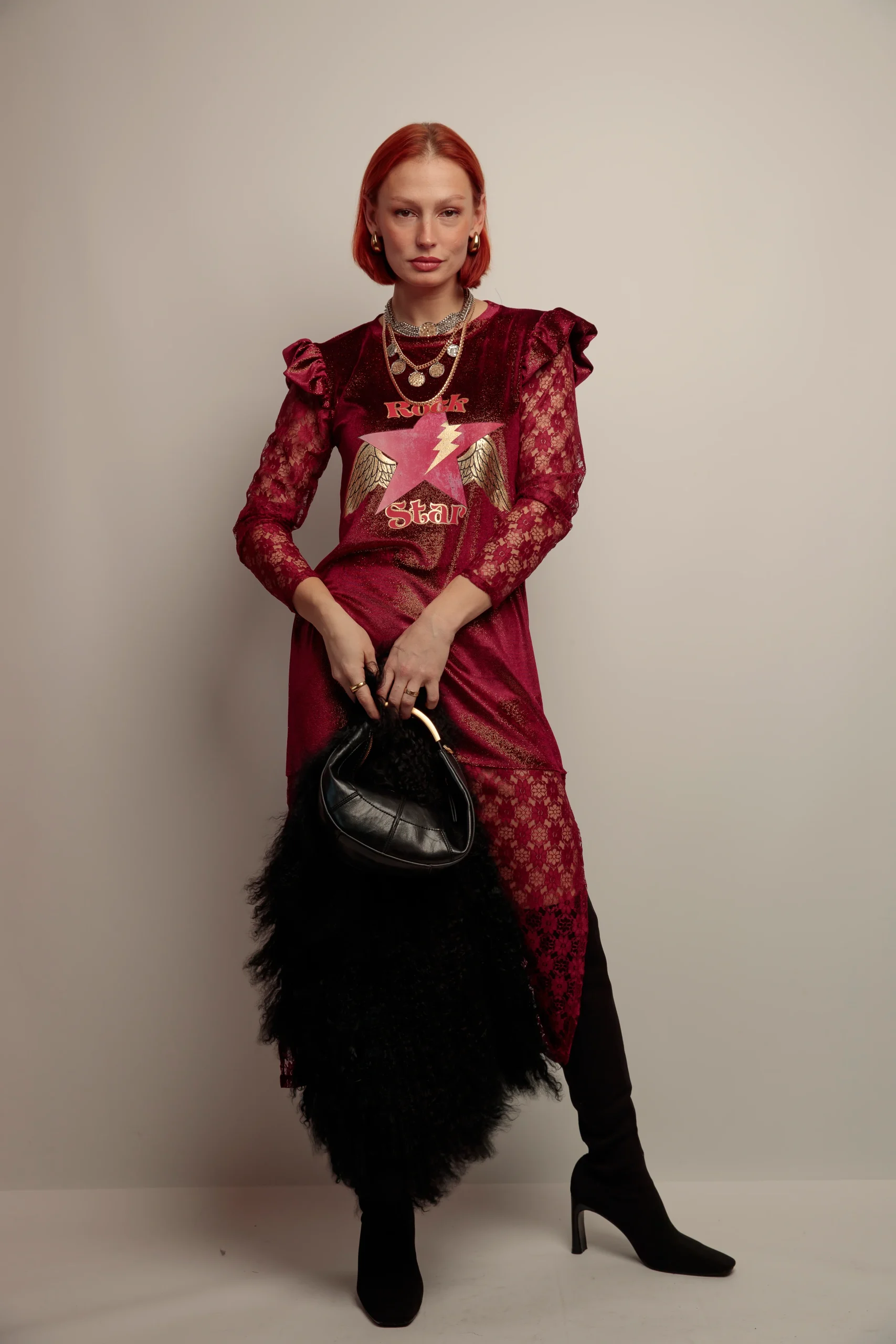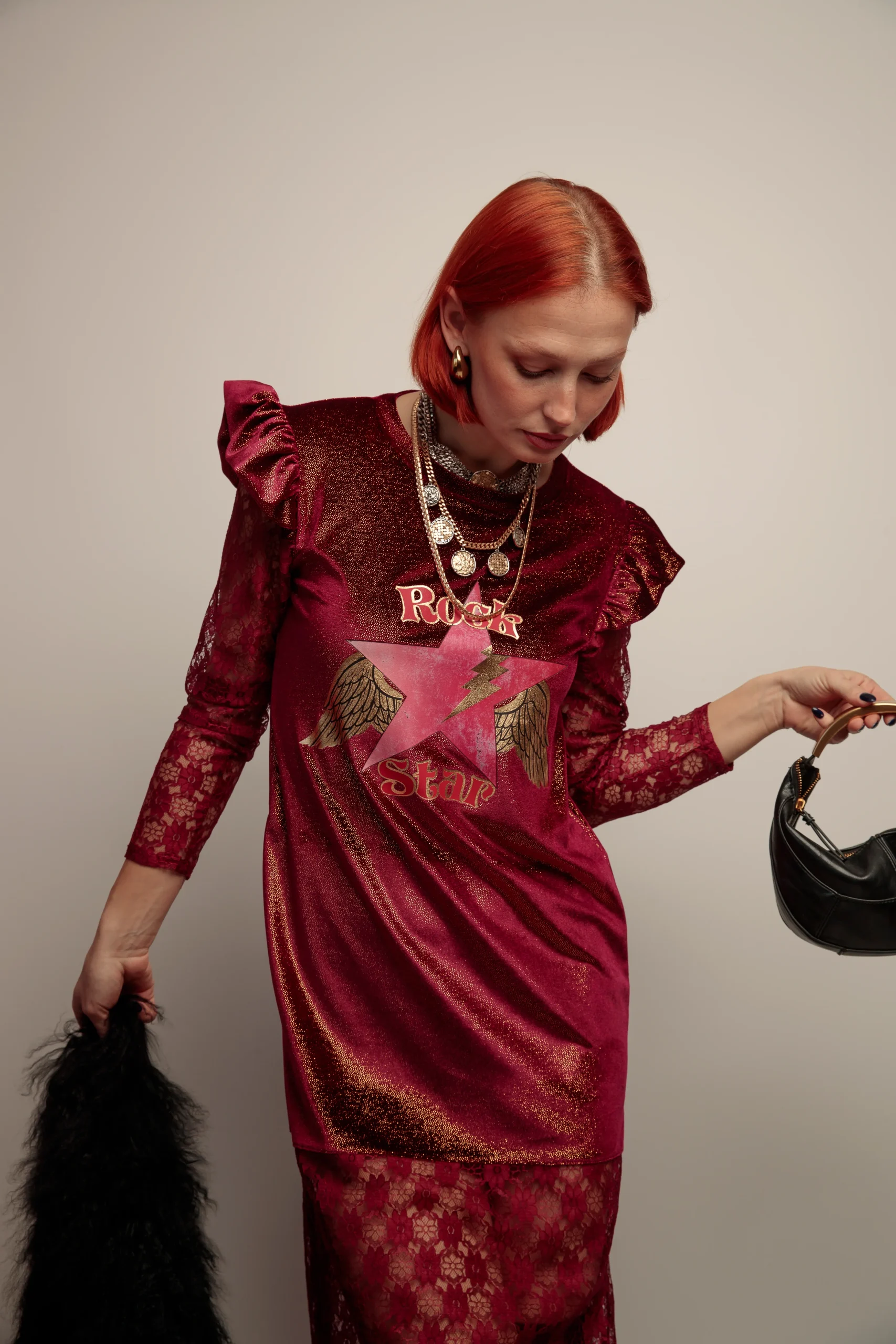 Vestido largo de mujer, con cuello redondo, y manga larga confeccionada en encaje color granate con mini volante de terciopelo granate en el hombro. El vestido está confeccionado en tejido de terciopelo granate con acabado satinado y micro destellos dorados, el bajo combinado con tejido de encaje y con aberturas laterales. Estampación frontal a contraste.