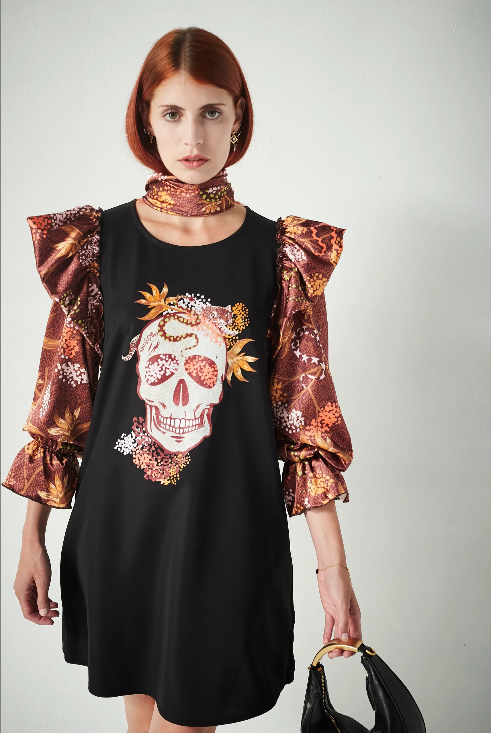 - Manga larga abullonada en tejido satinado estampado, con volante en el costado como detalle distintivo.