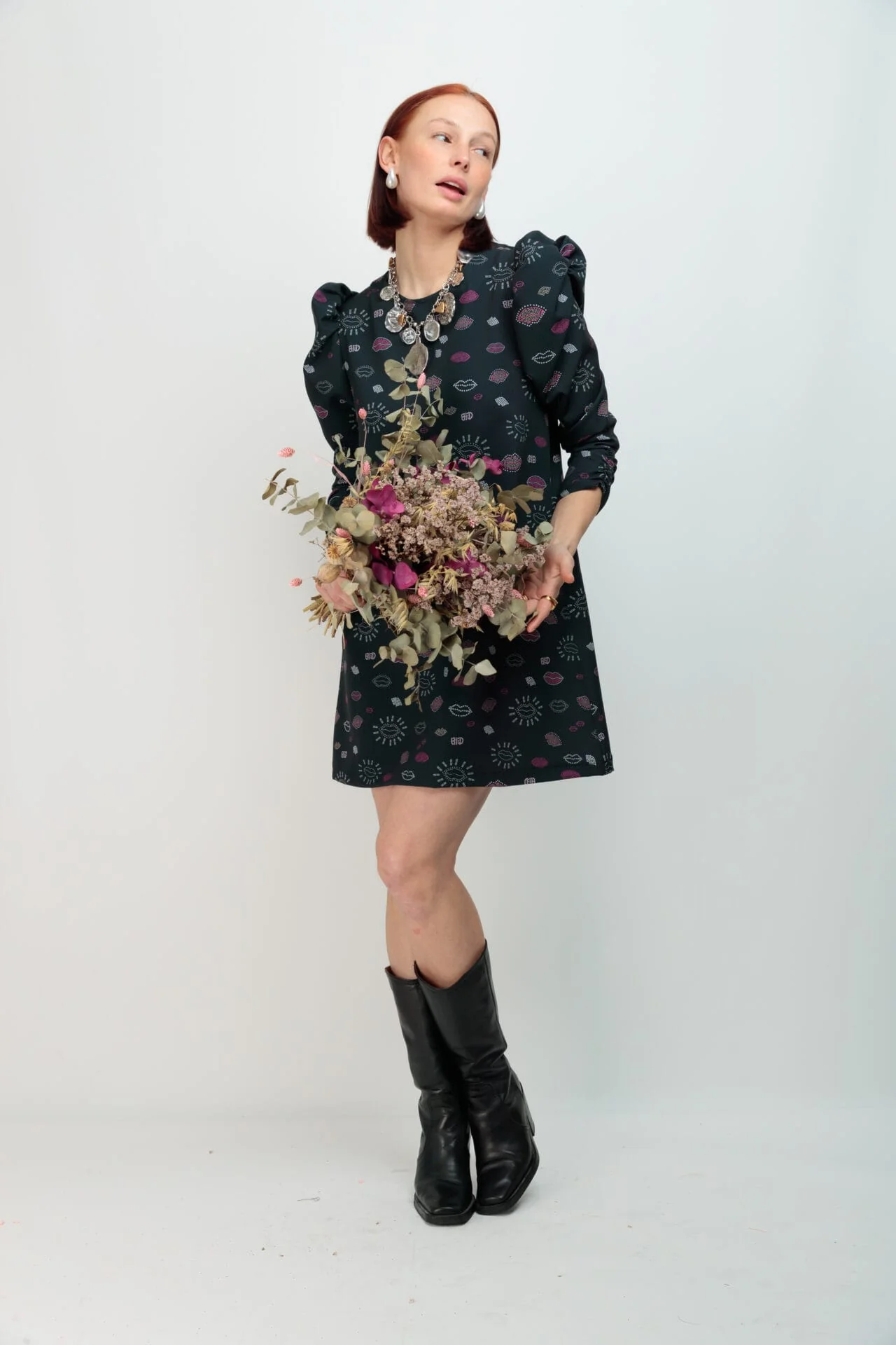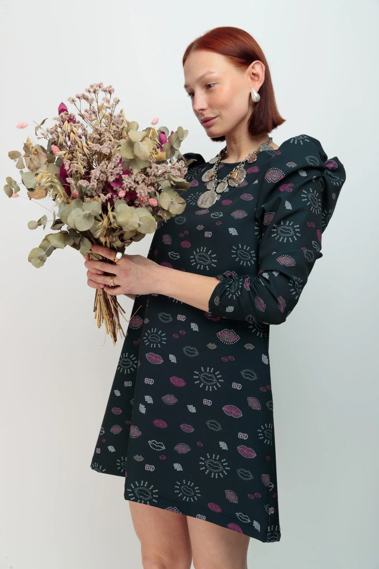 Vestido corto estampado, con cuello redondo, corte evasé y con bolsillos. Detalle de manga larga abullonada con frunce en el antebrazo para una mejor adaptación de la manga.
