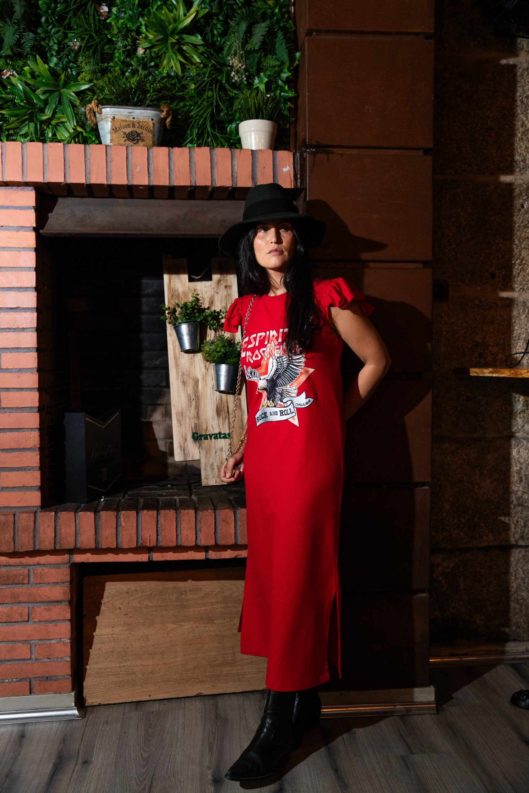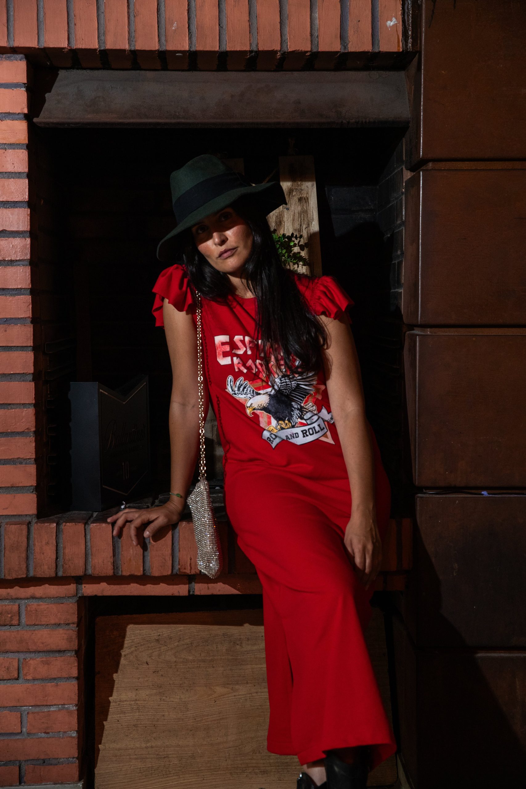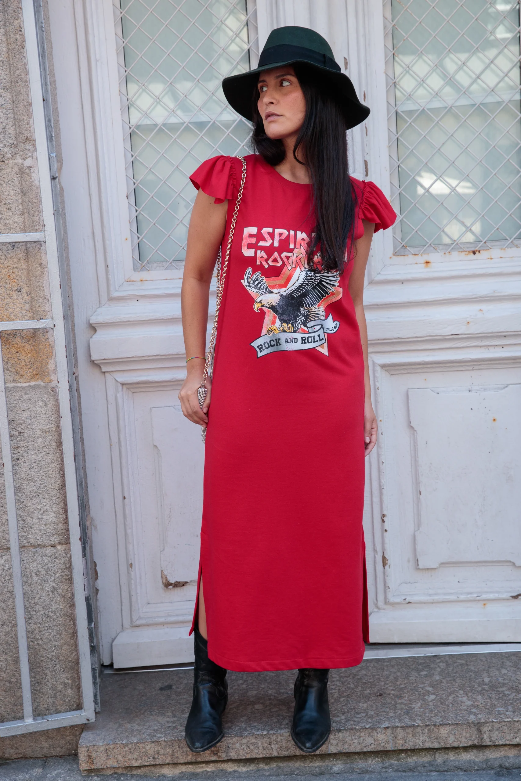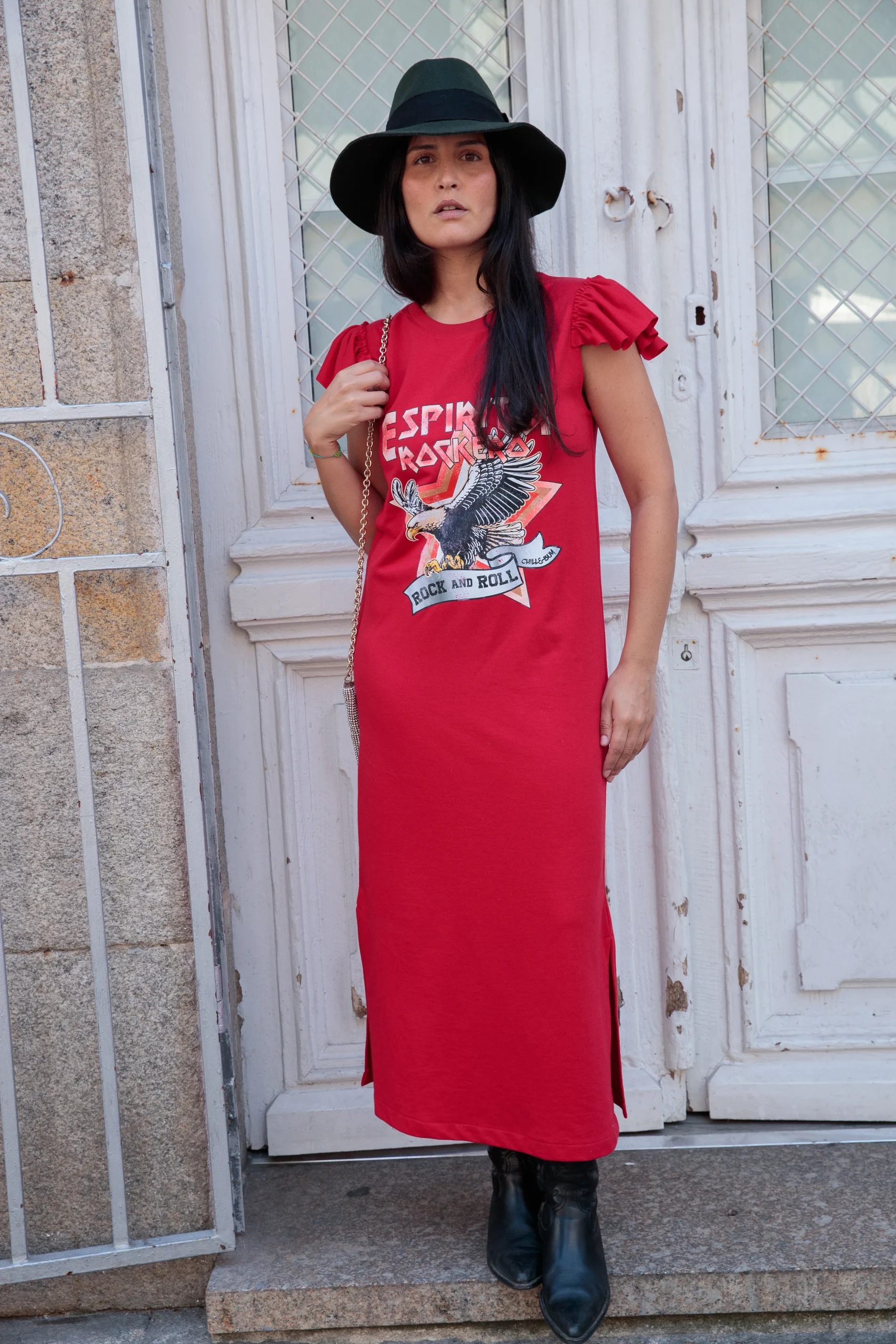 Vestido largo de algodón con print frontal de águila y texto “Espíritu Rockero”. Diseño recto, sin ajuste a la cintura, confeccionado en punto de algodón suave de gramaje medio. Presenta escote redondo, manga corta con volante fruncido tipo butterfly y aberturas laterales en ambos bajos para facilitar el movimiento. Largo por encima del tobillo. Color rojo vivo. No lleva bolsillos.