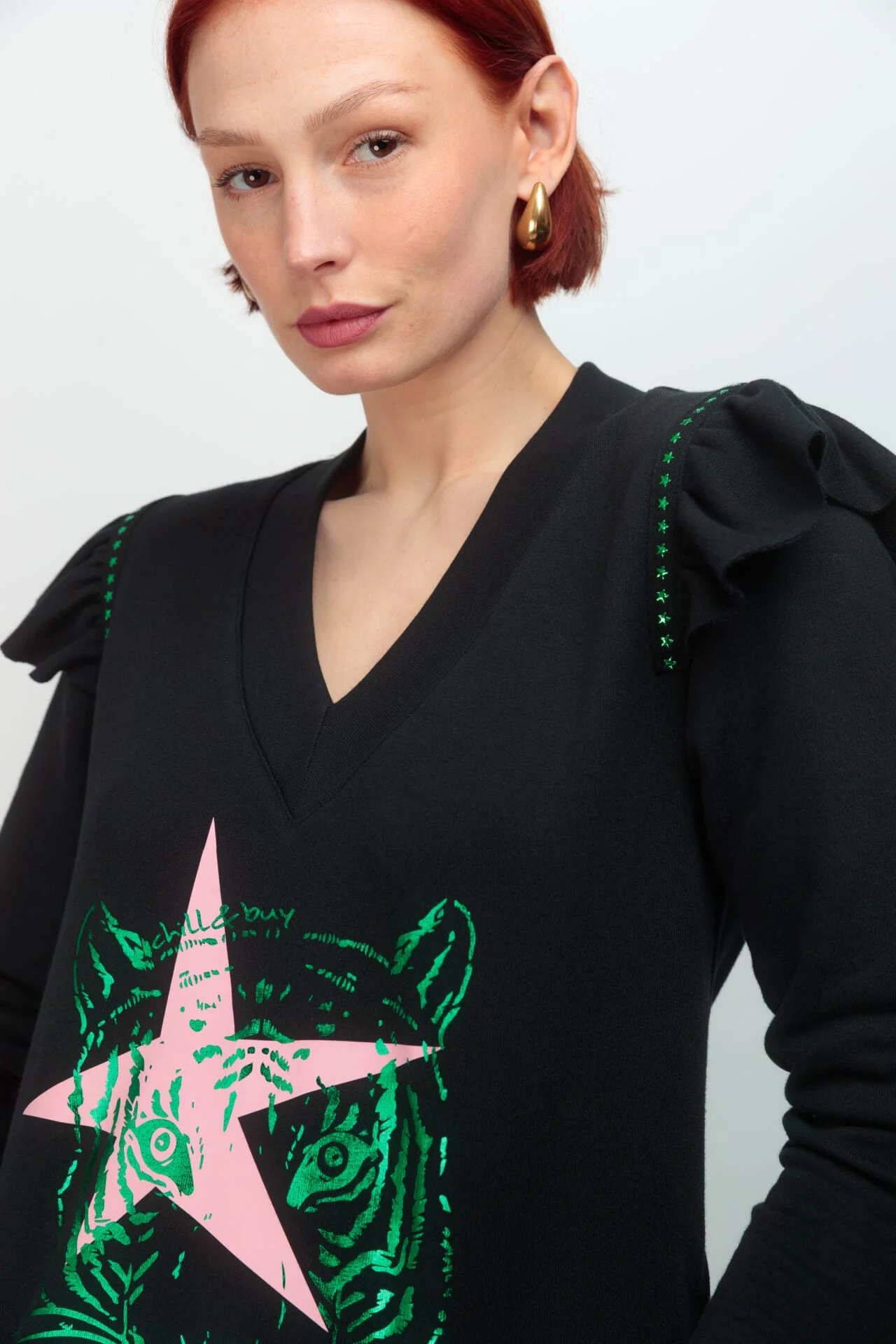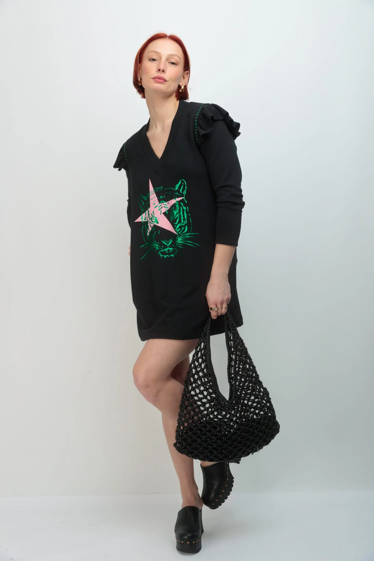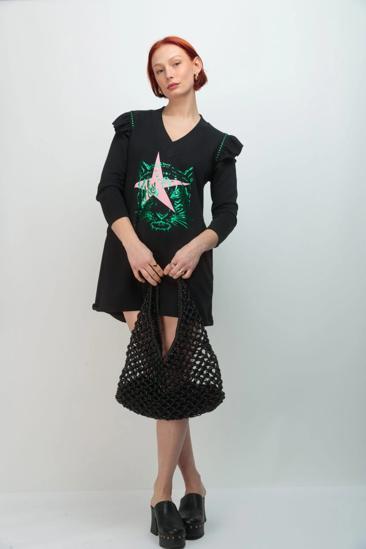 Vestido corto de mujer en tejido de punto de algodón en color negro. Diseño de corte evasé con bolsillos, manga larga con detalle de mini volante en la sisa, rematado con tira de tachuelas metalicas en color verde con forma de estrella. Confeccionado en Vigo. Estampación frontal.