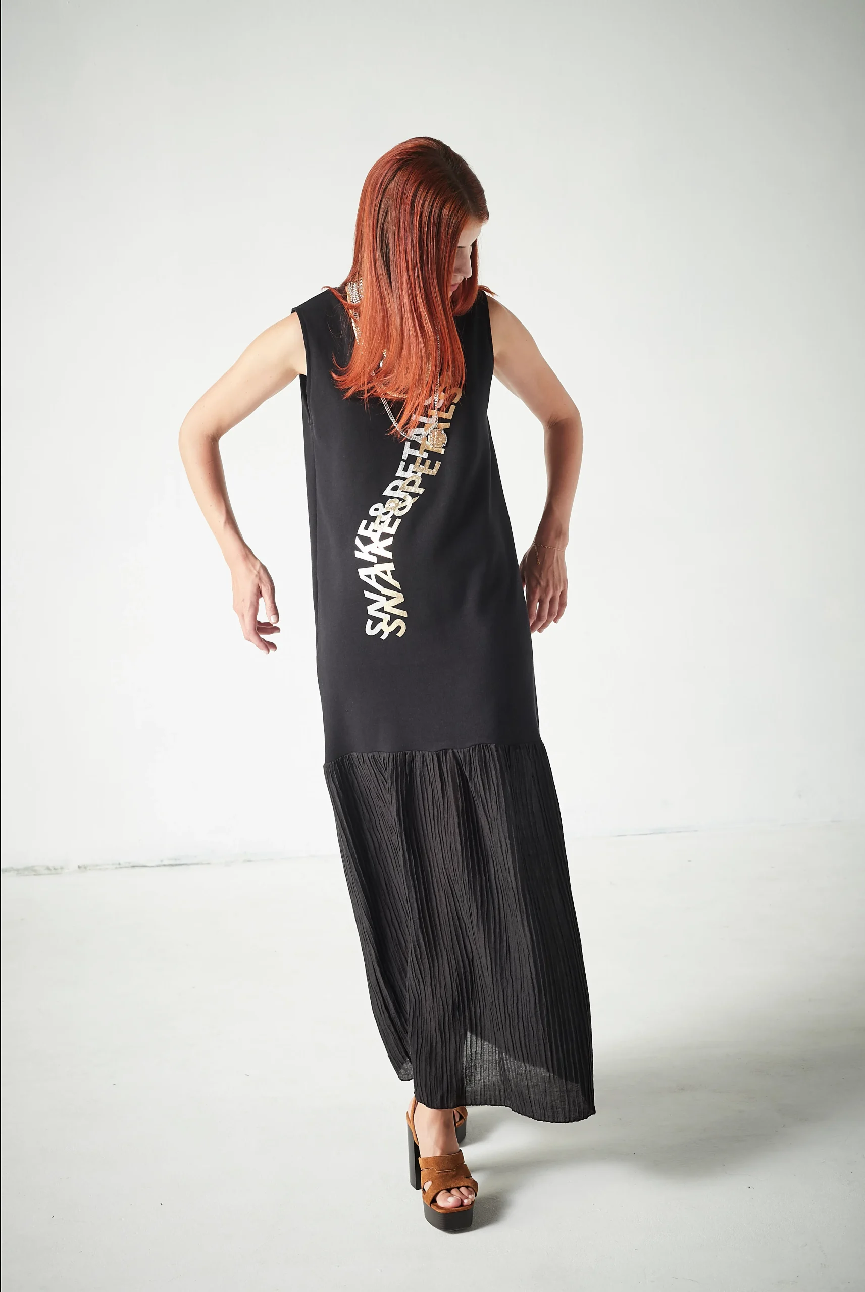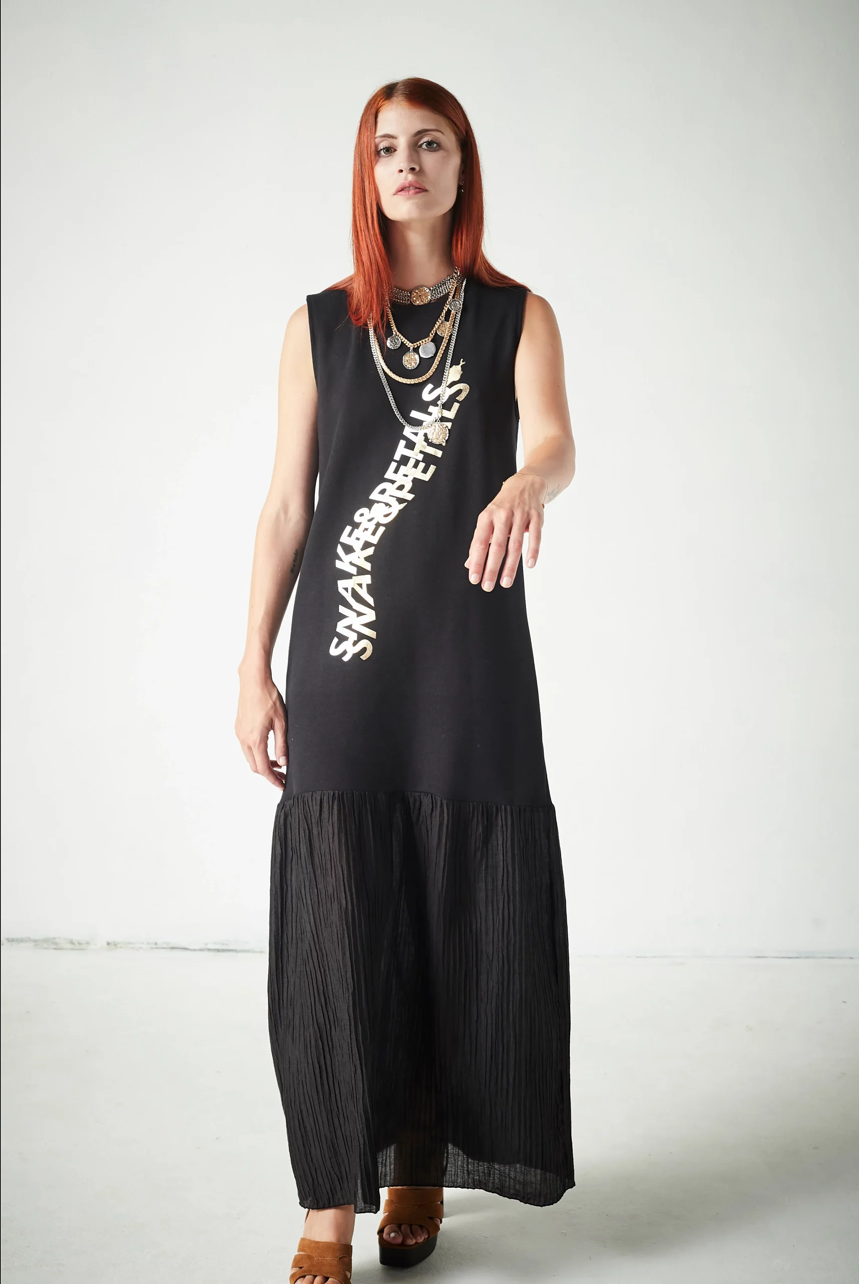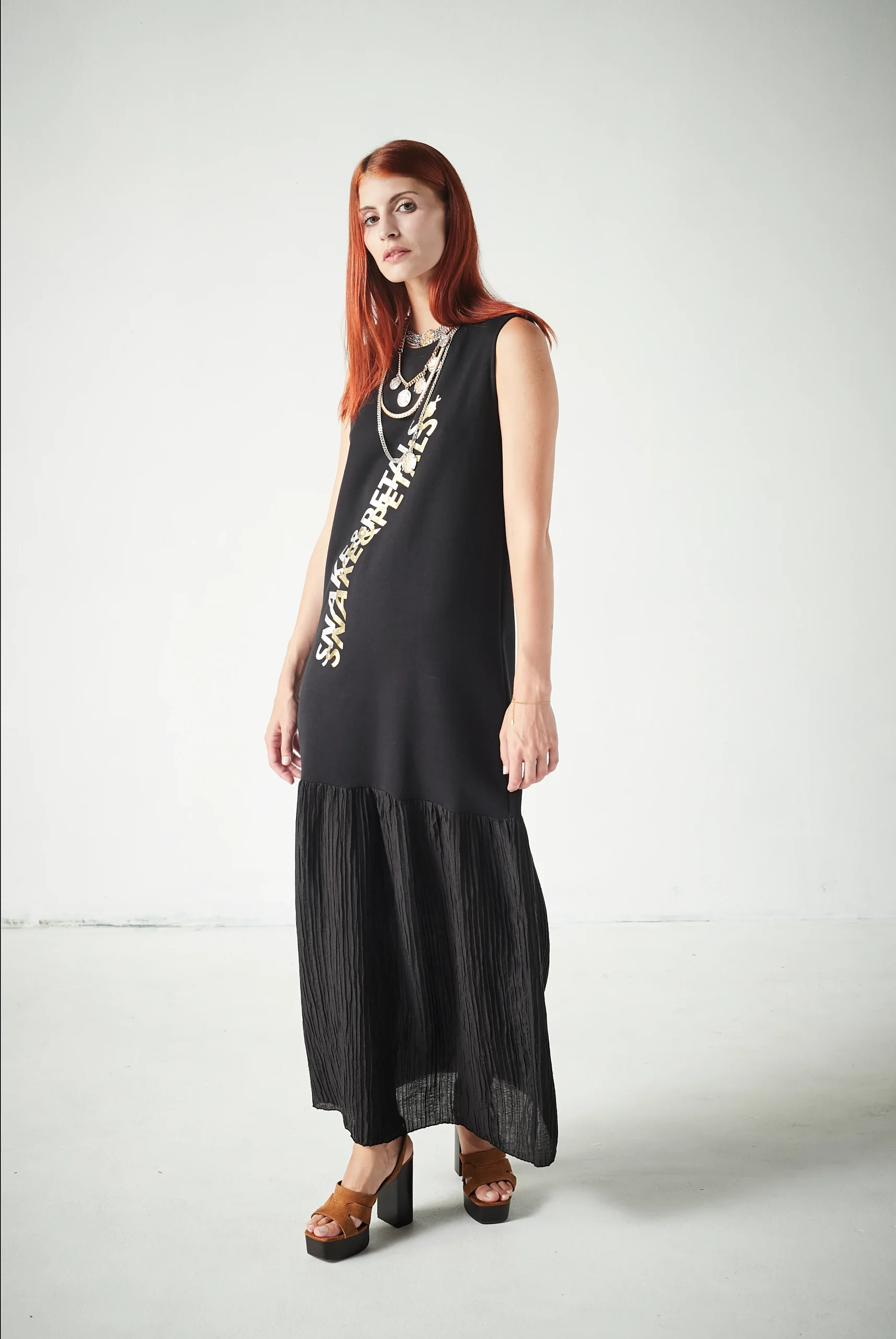 Vestido largo con cuello redondo y diseño que combina texturas para un acabado sofisticado y actual.
