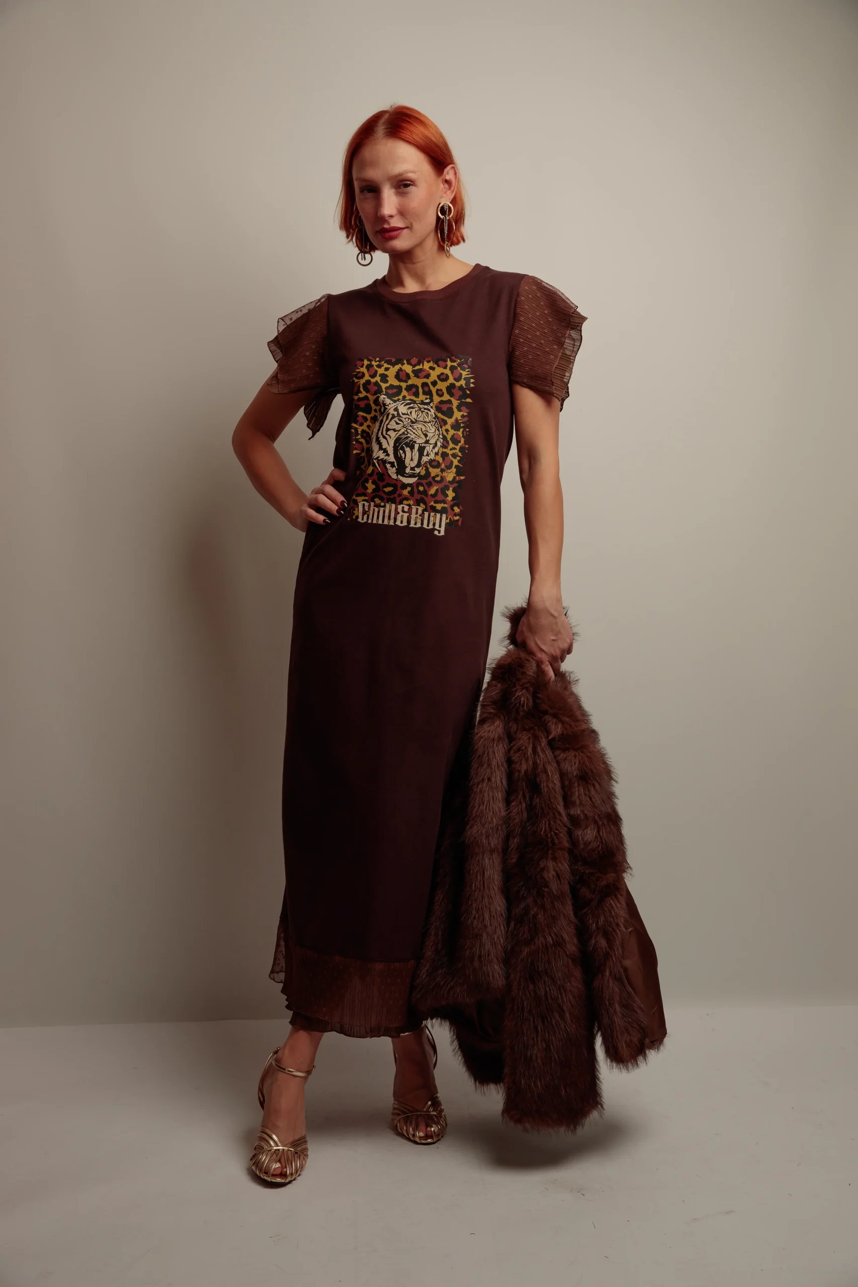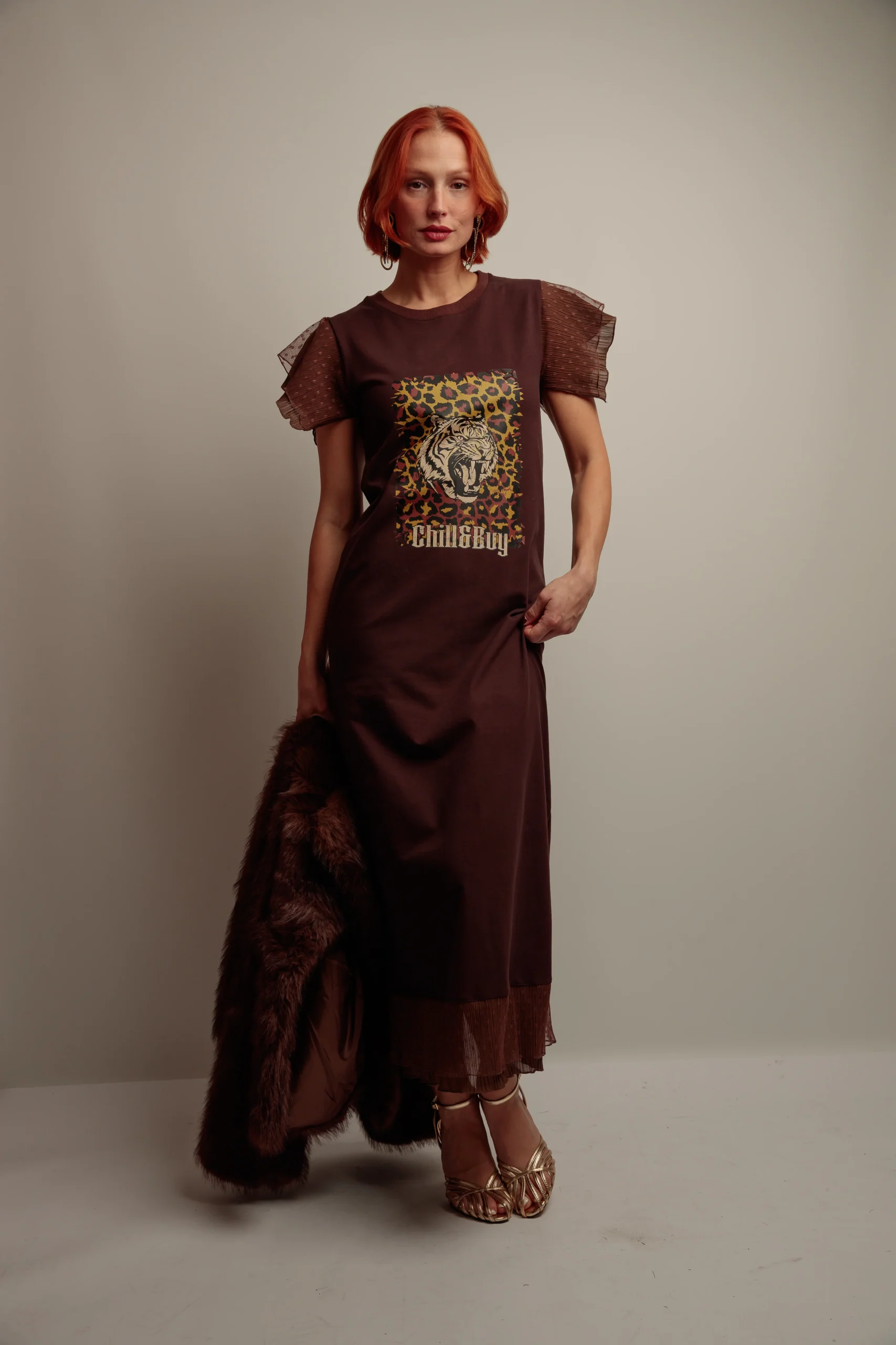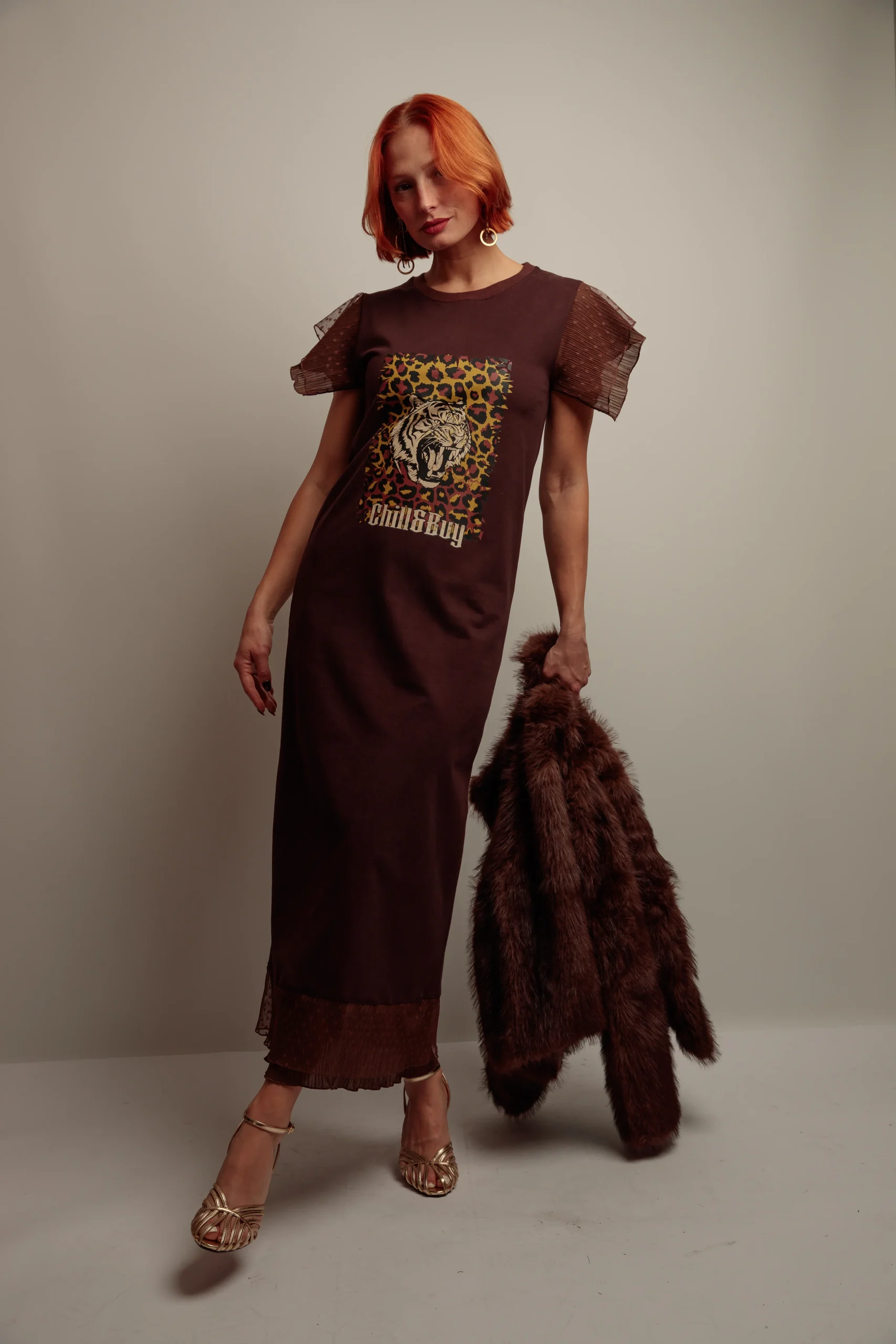 Vestido largo, cuello redondo, corte recto con abertura trasera pronunciada. Detalle de volantes de tul a tono en el hombro y en el bajo. El vestido está confeccionado en tejido de punto de algodón con felpa interior en color marrón chocolate. Estampación frontal a contraste. Confeccionado en Vigo.