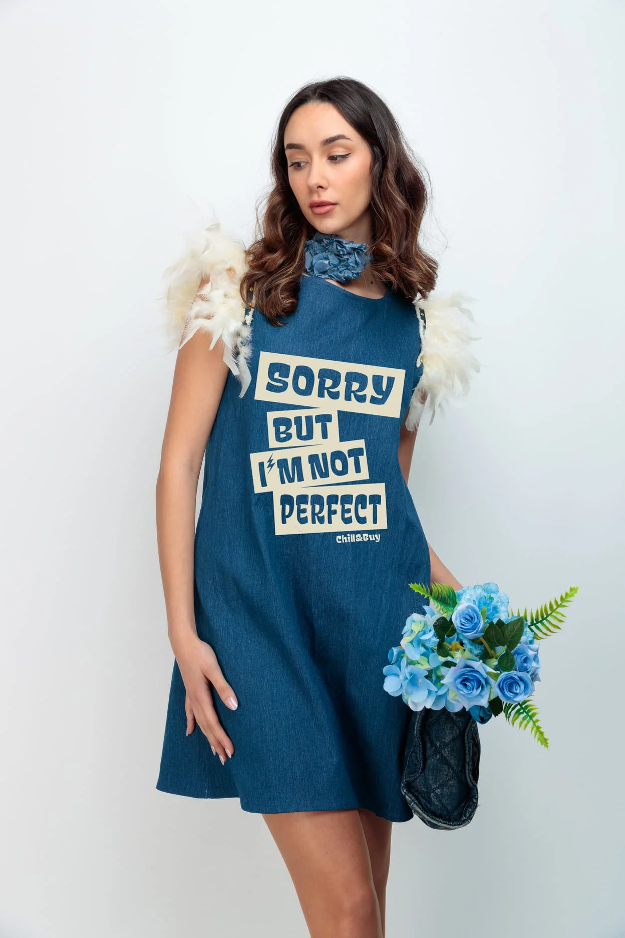Vestido tejido denim, con cuello redondo, corte evasé, y con bolsillos . Detalle de plumas con tachuelas en la sisa.