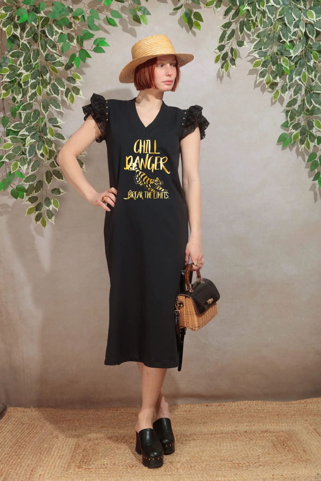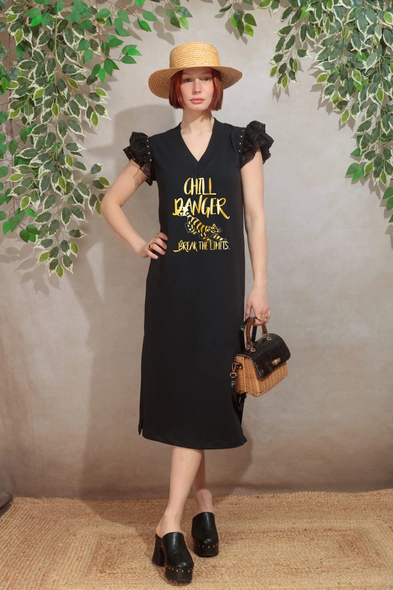 El Vestido Vera Chill Danger es una prenda imprescindible para quienes buscan destacar con estilo y personalidad. Este vestido combina lo mejor de la moda urbana con un toque elegante, gracias a su corte recto, su cuello pico y los detalles únicos que lo convierten en un imprescindible. La frase estampada en el frontal, «Chill Danger – Break the Limits», refleja una actitud audaz y desafiante que no pasará desapercibida.